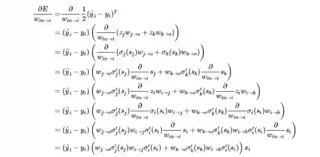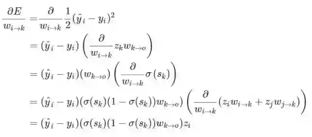 如果一个神经元有多个输入端怎么办,从 j 到 k 的权重更新规则会不会影响从 i 到 k 的权重更新规则?为了弄清这个问题,我们可以对 i 到 k 的权重手动求导。
