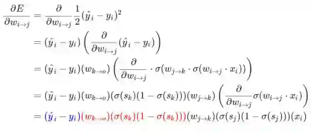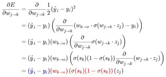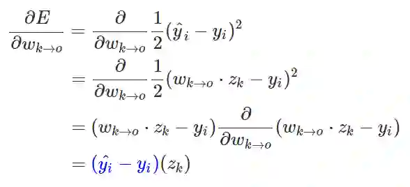 对于这样一个简单的案例来说,我们很容易就找到其偏导数项。现在我们将求导后的一部分标以蓝色,然后看看我们是否能推导出可以在迭代算法中使用的模式。首先我们需要了解 k 层到 o 层之间的权重(w_k→o),也可以理解成这两个神经元之间的连接强度。如果我们的输出是线性单元,那么():