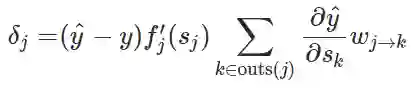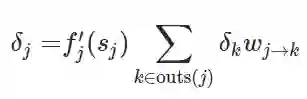 另外,如果神经元 j 是一个隐藏神经元,那么另一层的神经元 k 属于 j 的输出神经元。我们可以使用链式求导法则进一步解释: