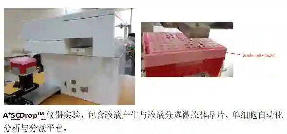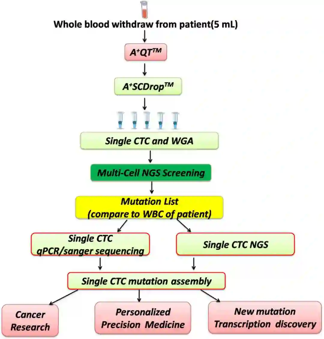 A+SCDropTM是利用油包水(water-in-oil)的乳化技术结合高速细胞介电特征分析技术。此晶片系统可将A+QTTM富集后的产物样本,分成数百万颗0.1 nL的极小液滴,由于全血经A+QTTM富集后的样本仅剩CTC与数万颗WBCs(~104 WBCs/0.5 mL),因此每颗小液滴中最多仅会存在一颗细胞,再由具独创专利技术的的高介敏介电特性侦测系統,深度分析液滴中的介电特征,可精准分辨空液滴、包覆WBC的液滴、包覆CTC的液滴等,5 mL全血经A+QTTM (>85%)+ A+SCDropTM(>70%)系统后,可捕获近7成的单细胞CTC液滴,仅低于5颗以内的WBCs可能会被误判(本系统80%以上的实验数据WBCs均在3顆内),侦测后的单颗CTC可由本系统的自动化平台连动的分派入各自独立的单一反应小试管内,进行100% CTC丰度的全基因扩增。由于本系统所有机制(富集、单细胞分离、侦测、分选)均为纯自然物理的机制方法,无损细胞活性,实验数据结果显示,经本整合系统取得的单细胞全基因扩增(WGA)成功率高达80%以上,相比于现有市面上的单细胞捕获平台(存在染色或化学性破坏),大幅提升了超过30%以上的WGA成功率。此平台相关技术已申报13项国内外专利。