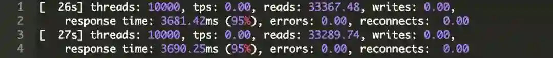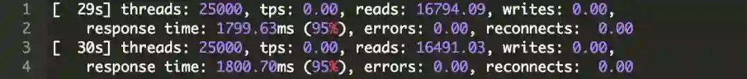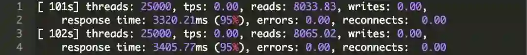 实现连接数从75k到100k并没有什么大的变化,我们只需要启动一个额外的服务器并启动sysbench就可以了。对于100,000个连接,我们需要四个sysbench服务器,每一个服务器显示: