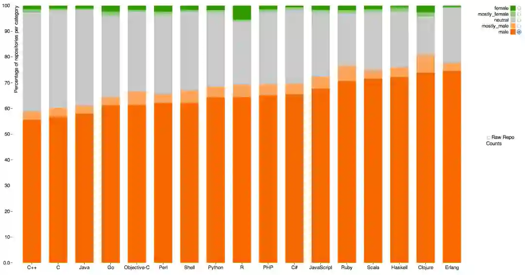 GitHubrepo按照语言划分的男女用户比例,最上面的绿色是确认的女用户(2014年数据)