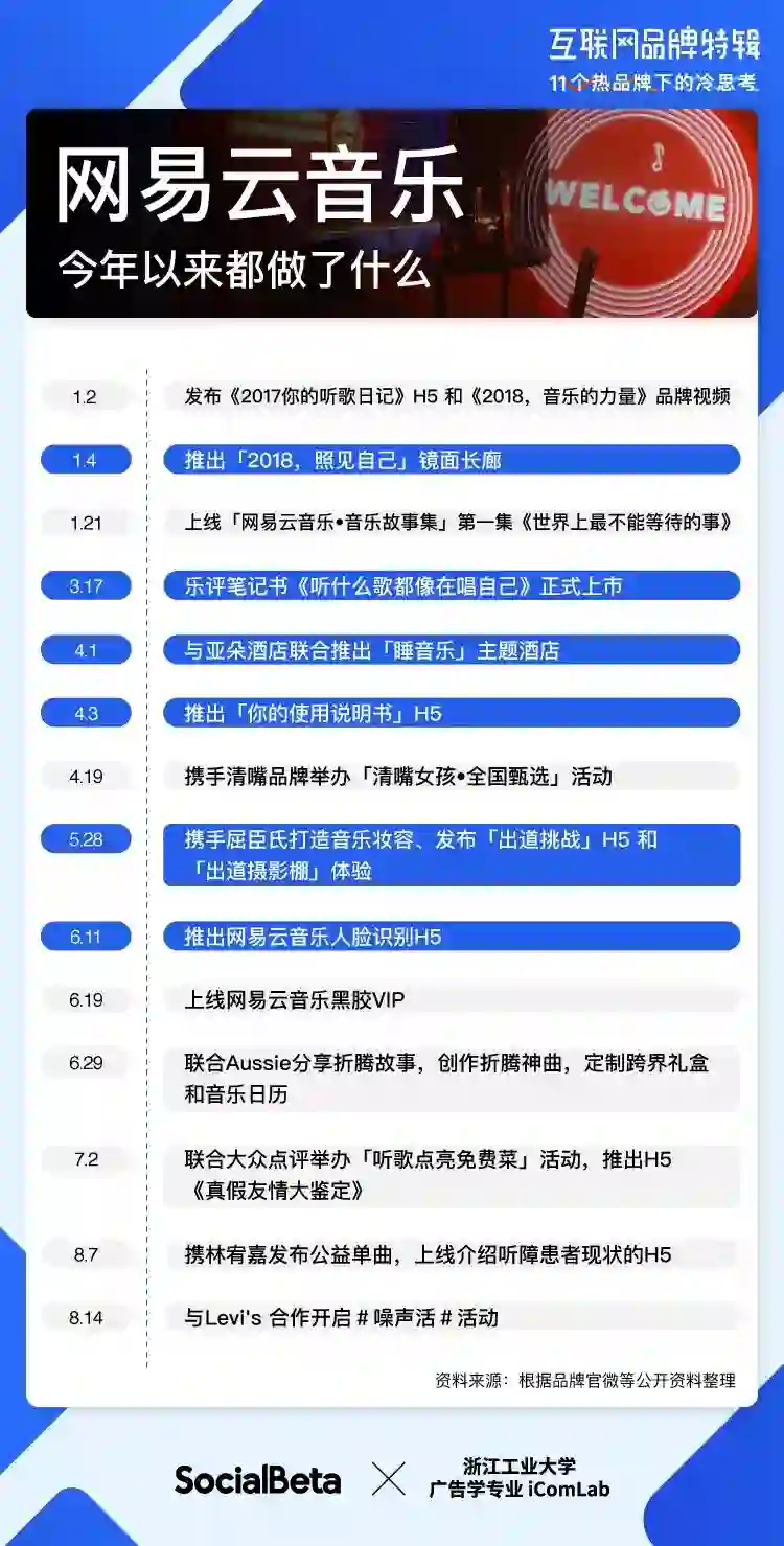 每一次营销活动都能看出网易云音乐的用心打磨,也正因如此,网易云音乐才能一次次营销刷屏,被戏称为「一家被音乐耽误的广告公司」。回顾 2018 上半年,网易云音乐更加注重「看见音乐的力量」这一品牌形象,可以看到网易云持续地利用走心乐评优势,并打造多个 H5 刷屏朋友圈,同时积极进行线下布局,扩充其音乐社交圈,发挥品牌的 IP 势能。尽管网易云音乐在版权上仍有短板,不过其 18 年推出的云梯计划有望形成助力。毕竟,做好音乐 APP 本身之事,也是网易云音乐应当考虑的事。