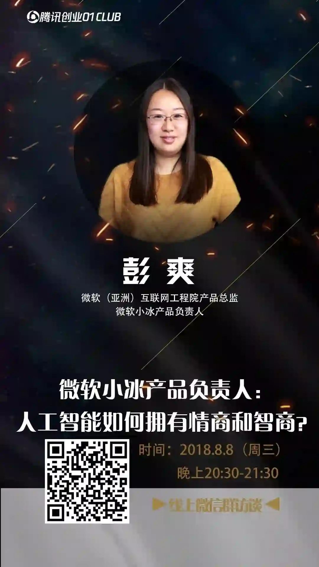 8 月 8 日,我们邀请到微软(亚洲)互联网工程院产品总监、微软小冰产品负责人彭爽,参与“腾讯创业01CLUB”第二期。
