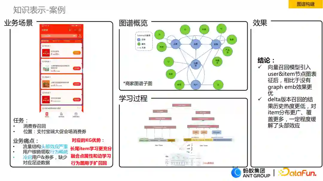 图谱认知这部分我主要介绍知识表示的一个案例。在支付宝中有一个会场消费券的频道场景(超级567),我们做的是消费券内容理解和深度召回。深入这个场景可以看到,用户需求是很明确的,但是也会有几个痛点,一个是流量结构的头部效应非常严重,通过行为召回的一般都会有马太效应;另一个是用户核销领取行为稀疏,一周或者一个月只进行几次浏览点击;还有不仅是冷启动的用户很多,每天新增的券也很多,新增券背后隐藏着用户的行为很少。