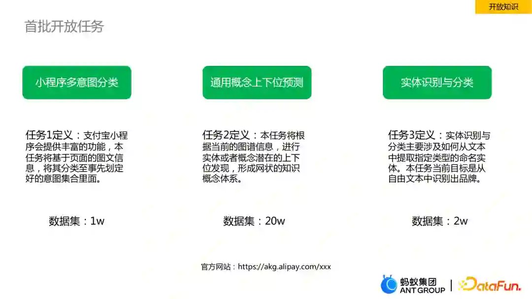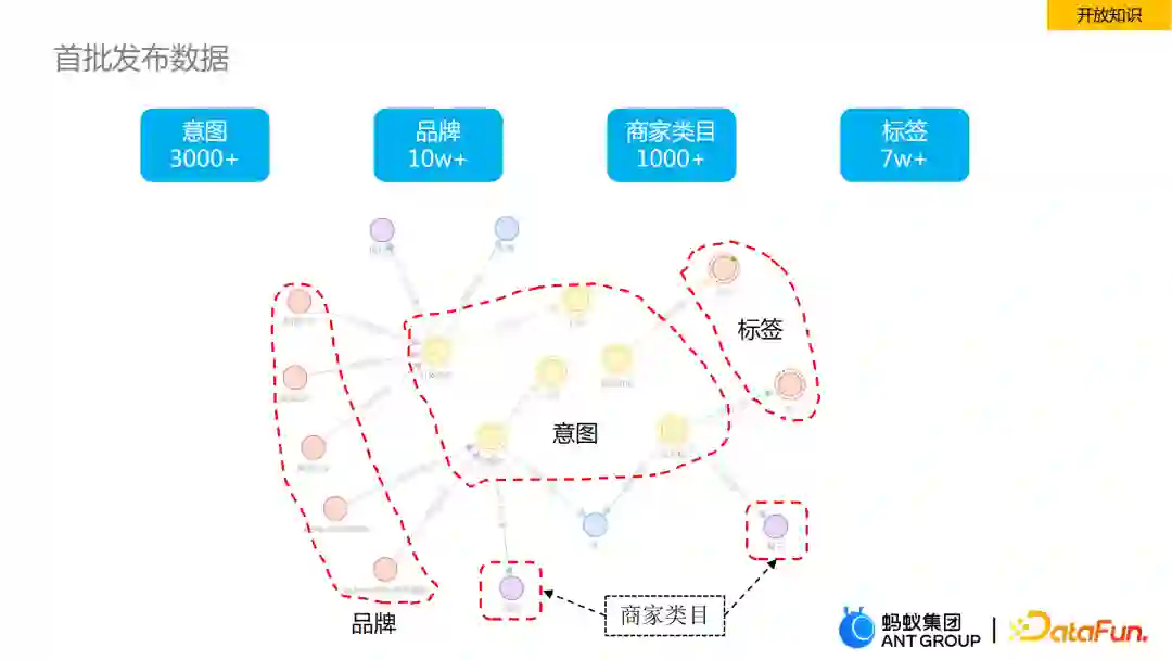 我们首批准备发布的数据是偏概念层的,简单介绍一下概念域里的知识,例如意图、品牌、商家类目以及标签,它们在图里是通过边进行关联。意图是一类复合概念,用户在支付宝中搜索时会带有较强的用户需求,例如“打车”、“查公积金”等,这些需求背后就是用户的意图。品牌不仅来源于支付宝认证的一些数据,也会从外网抓取一些品牌,并进行归一质检,最终沉淀了10万+的品牌。这些品牌与意图也是有关联关系的,比如通过“星巴克”品牌,人们很容易想到在星巴克买咖啡,这就与意图产生了关联关系。同时,每个意图也会和标签有关,比如“买女鞋”的意图下适用人群就是女生。