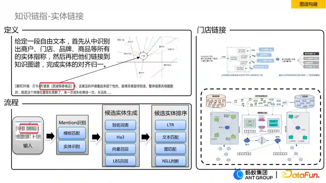 实体链接,即给定一段文本,首先识别出潜在实体的指称(mention),然后再把他们链接到知识图谱中,完成实体对齐和归一。比如我们有一条评论,将评论中的实体与图谱链接起来,会对这个实体有语义的增强,例如“外婆家”这个商户实体,我们通过跟图谱关联可以进一步获取到该商家关联的商品信息。