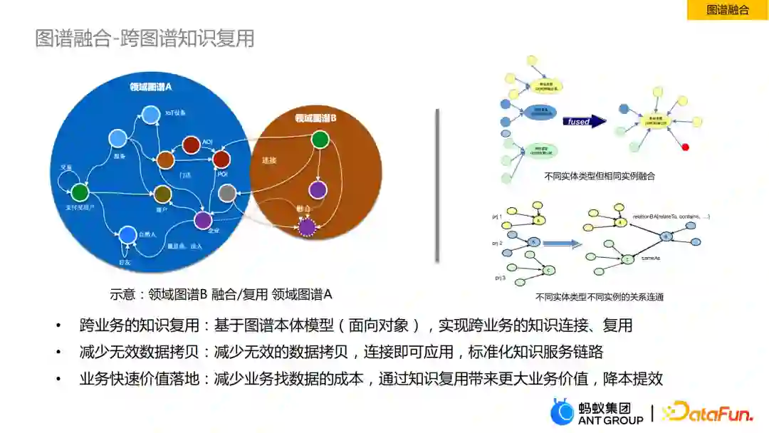 在蚂蚁的业务背景中,商家和用户是两大最核心的要素,各个业务团队会基于商家和用户去构建各自的领域图谱,对于一个新的业务需要构建图谱时,重新获取结构化信息构建图谱的成本是很高的,那我们提出了一个比较好的解决方案,以蚂蚁商家图谱为例,我们通过跨图谱融合的方式能够快速帮助业务做一些知识复用和快速验证的过程。我们主要做了不同实体类型但相同实例的融合,以及不同实体类型不同实例的关系连通。最终可以达到三个目的: