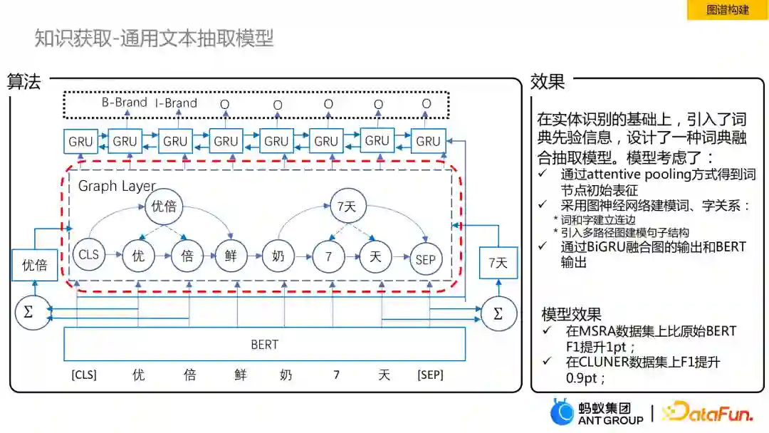 接下来介绍我们在文本抽取上的模型。众所周知,文本抽取涵盖范围是比较广的,包括实体抽取,关系、属性的抽取,还有SPO的抽取。这里主要介绍通用的实体抽取的模型。按图上这个框架从下往上看,最下面是用Bert获得token表征,上面一层加入了graph layer,再上面是双向的GRU,最后是label预测。相比直接用Bert做实体抽取,差别在于我们模型加入了graph layer这一层。当前业界和学术界都在知识增强的NER这个方向进行了大量探索,研究关键在于如何把领域词信息放入知识抽取的模型中,一些做法是将这部分信息直接加在Bert的输入层,即做了简单的拼接。我们模型是在graph layer中通过构建图神经网络来学习词与字之间交互的特征。获得这个特征之后,再通过BiGRU对Bert的输出和graph layer输出进行融合,从而进一步预测每一个token的label信息。我们的模型在MSRA数据集上比仅使用Bert在F1上有1pt的提升,在CLUNER数据集上同样也有0.9pt的提升。