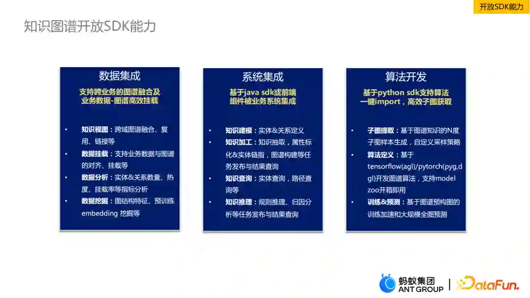 最后介绍知识图谱开放SDK能力。SDK开放背后有三层集成的能力,第一个是数据集成,我们可以支持跨业务的图谱融合,以及获取到业务数据后直接挂载到图谱中,进一步可以做可视化分析。第二环节是系统集成,基于Java sdk做知识加工、知识建模、知识查询以及知识推理,快速完成图谱构建。第三部分是算法开放,我们会基于python sdk支持算法一键import,可以进行子图提取,也可以基于tensorflow或pytorch开发图谱算法。