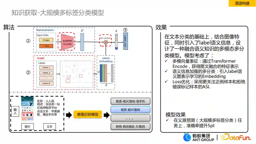 在我们的一些场景中,比如商户门店分类、小程序页面的意图分类,这里面会有丰富的图片信息,而这些图片中会有结构化的layout信息。这些场景中还有很多object,这些object的语义含义很明确,将图片信息进行融合后得到的多模语义表征,比纯粹的文本表征语义更加丰富。其次,我们面临的label可能上千甚至上万的规模,这些label的背后不仅仅是一个id,它的名称(比如“租赁-租3C数码-租手机”)有非常强的语义信息,同时这些label之间本身也会存在上下位、同义、相关等关系,自然而然可以将label从平铺形式转化为图的形式,生成label graph,接着基于图表征方法对label进行embedding表示。如果label没有名称或者结构信息,只需做一个随机的初始化。如果label有名称,可以使用Bert类模型去提取一个文本的初始化表征。在得到label的表征后,和输入的表征进行浅层的交互,得到label的分布,比如单分类任务只需要简单加一个softmax,如果是多分类,可以把softmax变成sigmoid。上面这些是我们模型的特点,同时在效果上,模型针对hownet的每个词进行义原预测,这里label有2000类+,在这个任务上,我们的模型相比于baseline有5pt的提升。