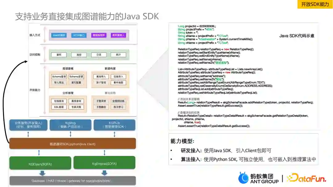 这里详细介绍一下支持业务直接集成图谱能力的Java SDK。从下往上看,最底层是图存储平台Geabase,向上是知识引擎的交互,再上面是图谱查询SDK,最上面是业务层面的支持。图谱通用SDK这块可以分为三部分,一部分是接入,我们提供了一些通用的接口;第二部分是访问控制,会做用户权限的控制,日志等一些数据上的统计;最重要的是开放能力,有图谱建模,即schema的管理能力;还有数据构建,可以做分析推理,最后进行算法应用。基于这套代码SDK,我们可以支持研发的接入,引用Client包即可,还可以支持算法接入,可以独立使用,也可以扩展开发。