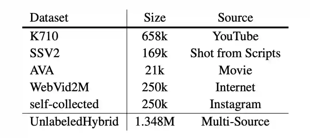 VideoMAE V2 旨在训练出一个更加通用的视频基础模型,能够泛化到不同的下游任务中。为了让模型更好地学到通用表征,我们增加了预训练视频数据的规模和多样性。具体来说,我们混合网络、YouTube、Instagram、电影、人工拍摄等不同来源的视频数据,构建出了一个包含 135 万视频片段的无标签多源数据集。值得说明的是,这是首次在如此大规模且多样化的视频数据集上对 video transformer 模型进行预训练。数据集的具体构成如下,更多细节可参考论文。