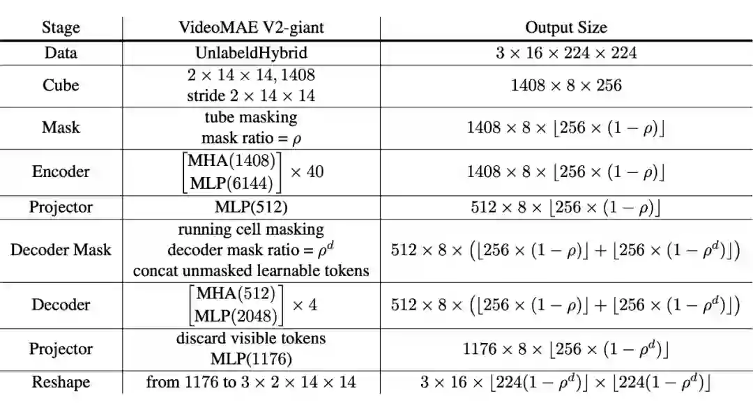 基于上述分析,我们提出了一种在百万视频片段的预训练数据集上,将 VideoMAE 扩展到十亿参数量级的简单有效的方法。技术上,我们设计了一种双重掩码策略,基于视频数据冗余性的先验,同时遮蔽编码器和解码器的输入标记。
