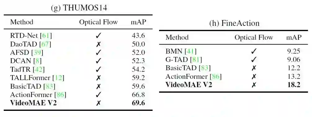VideoMAE V2-g 在 THUMOS14,FineAction 等数据集上测试时序动作检测性能。我们采用 ActionFormer 的框架进行训练和测试。训练时我们固定最大输入序列长度,测试时使用 Soft-NMS 筛去高度重叠的候选位置。