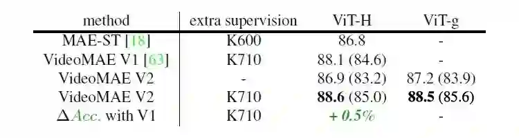采用 ViT-H 作为骨干网络,VideoMAE V2 模型在中间微调后的性能比 MAE-ST 高 1.8%。这一性能优势可能归功于更大的无监督预训练数据集和更大的中间微调数据集。尽管我们也在 SSv2 上进行了后预训练微调的实验,但结果表明这会导致微调精度下降。
