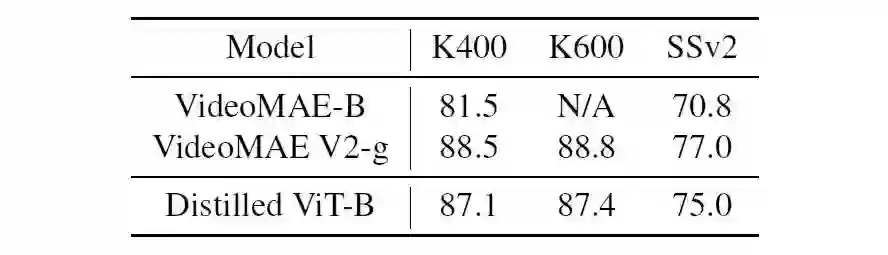 我们将 VideoMAE V2-g 蒸馏到 ViT-B 模型中,如上表所示,蒸馏后的学生模型表现出优异的性能。具体来说,我们用 VideoMAE V2-B 初始化学生 ViT-B 模型的参数,以 VideoMAE V2-g 作为教师模型(此处的 VideoMAE V2 模型都是后预训练微调阶段后的模型);接着在混合带标签数据集 K710 上进行 100 轮次的蒸馏实验,最小化教师模型和学生模型输出 logits 的 KL 散度。