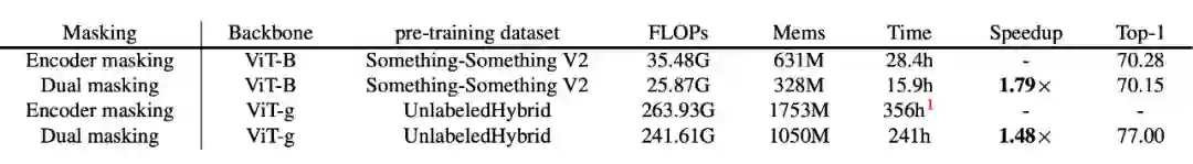 ▲ 双重掩码和单编码器掩码的对比。1 根据若干 epoch 的训练时长估计的总训练时长