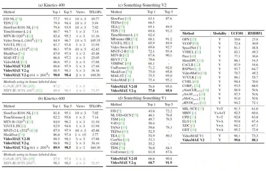 VideoMAE V2 在 Kinetics-400/600, Something-Something V1/V2, UCF101, HMDB51 等数据集上测试动作识别性能。