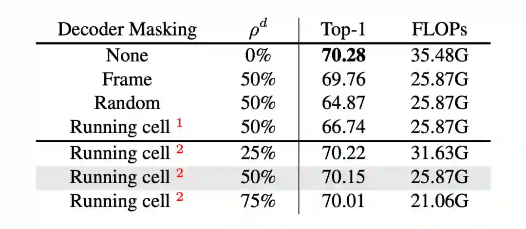 为保持 VideoMAE 的预训练性能,我们需要为解码器掩码图选择恰当的掩码策略。编码器选择高掩码率的管道掩码策略,从而缓解时序相关性导致的“信息泄露”问题。与之相反,在解码器掩码策略中,我们需要鼓励“信息互补”,即选择尽可能多样化的立方块重建,以减少该过程中的监督信号损失。我们比较了不同的掩码策略,最终选择运动单元掩码策略(running cell masking)。更多细节参照实验部分。