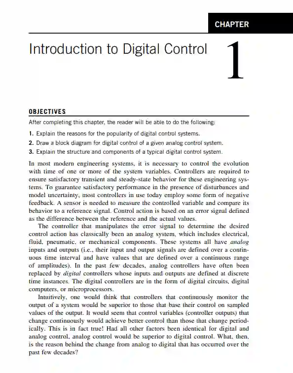 背景材料复习:包含复习材料,以帮助理解数字控制分析和设计。例子包括离散时间系统在时域和频域的讨论(从线性系统课程中复习)和s域和z域的根轨迹设计(从反馈控制课程中复习)。