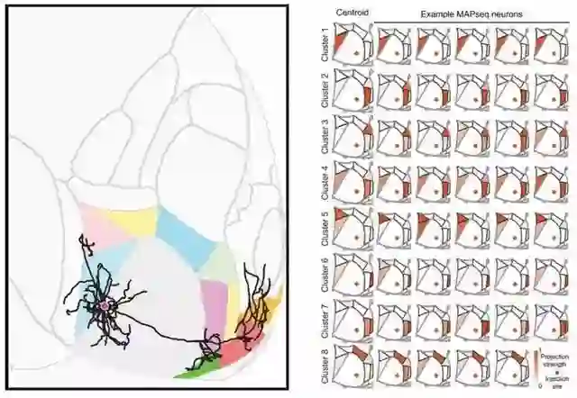 “一般人们都认为每个神经元都只映射到一个皮层区域,这是由于我们对大脑的基本结构缺乏认知,”该研究的共同第一作者 Justus M. Kebschull 博士说道:“我们的研究结果与通常的认知截然不同,有望会让未来的实验手段出现重大变化。”
