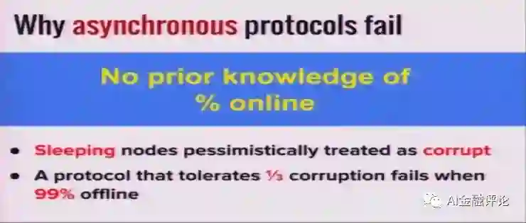 那么,为什么非同步协议也会失效呢?原因在于在非同步协议中,睡眠节点将会被视为作恶节点。假设某个协议可以在已知数量情况下允许1/3作恶者存在,但如果有99%节点为沉睡节点,那么这些节点被视为作恶节点,这样你无法得到足够选票达成共识。