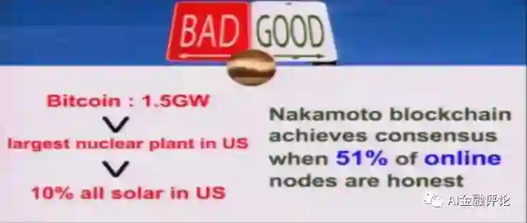 我们说比特币的中本聪区块链(PoW模式)具有鲁棒性,这有两方面含义:好处是,中本聪区块链在大多数在线节点诚实时可以达成共识;但缺点是:能耗太高。今日用于比特币挖矿的电力高达1.5GW,比美国最大的核电站发电量或者美国10%的太阳能发电量都要大。