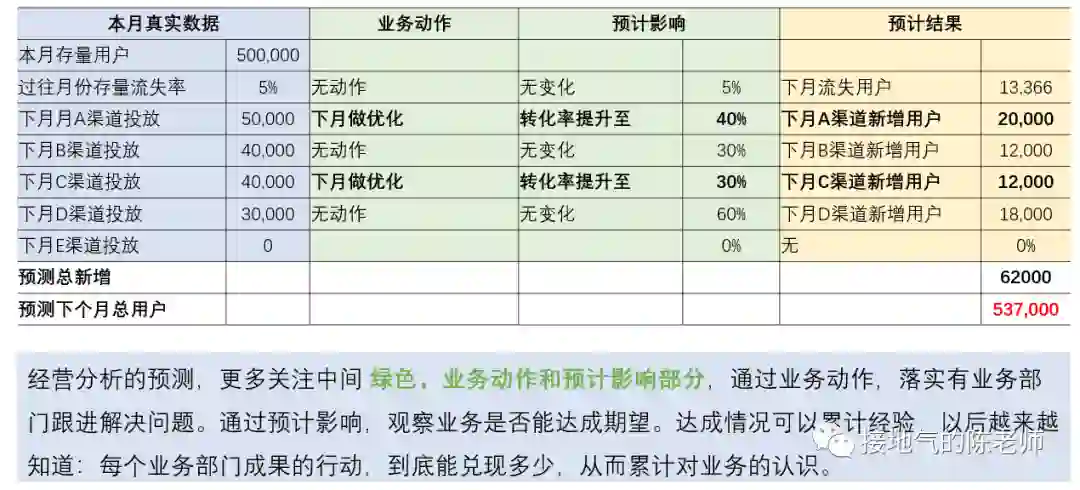 注意!在经营分析上的预测,和做用户运营、商品推荐的预测完全是两码事。经营分析上的预测考虑的更多是自然发展趋势+业务动作影响。到底自然趋势会怎么走,业务能主动影响到什么程度,有没有要额外注意的,这些才是关键。