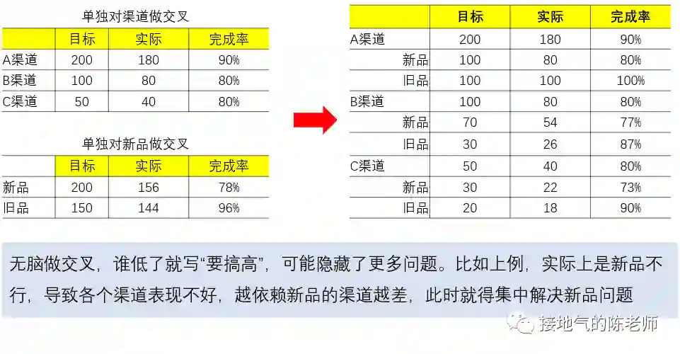 注意!业务之间可能有关联性,比如看起来客户、渠道、分公司都有问题,实际上可能是某个产品没有做好,导致了一系列数据指标都变化。在分析业务结构的时候,重点是找到业务上核心原因,避免无脑出表。