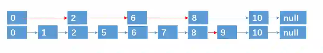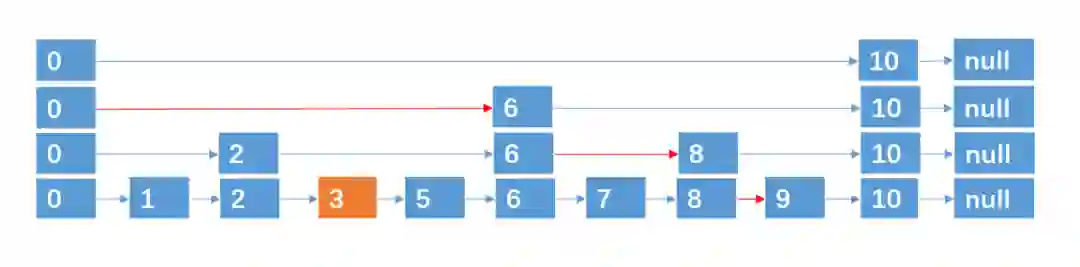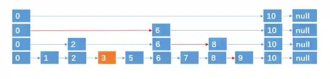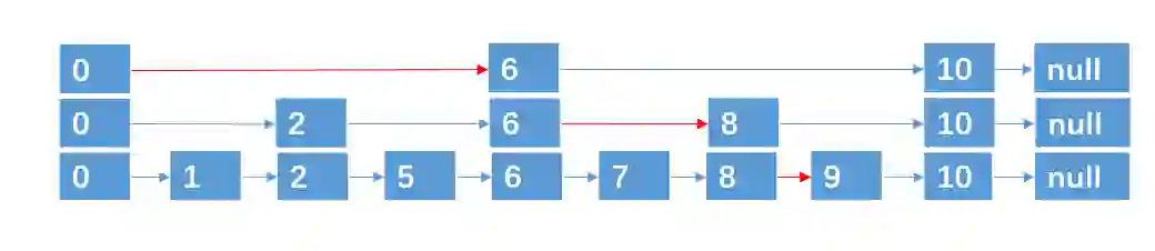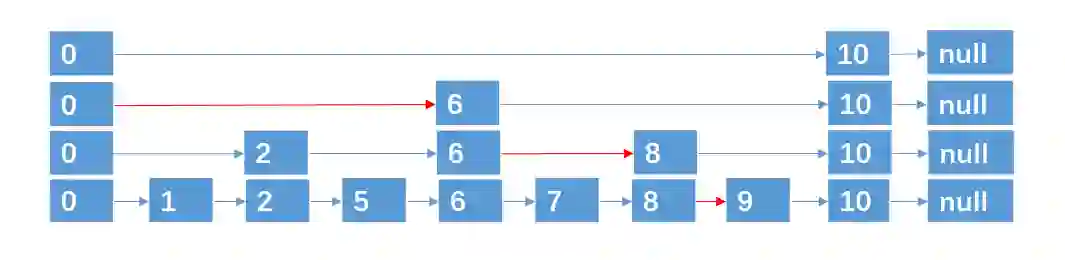 基于这种方法,对于具有 n 个元素的链表,我们可以采取 ** (logn + 1) 层指针路径的形式,就可以实现在 O(logn) 的时间复杂度内,查找到某个目标元素了,这种数据结构,我们也称之为跳跃表,跳跃表也可以算是链表的一种变形,只是它具有二分查找的功能。