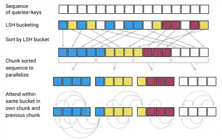 它们计算了每个桶中的注意力矩阵,并对相应的值进行加权。由于它们只能注意到给定的中的元素,当选取的桶大小合适时,这样做可以将注意力操作的整体空间复杂度从