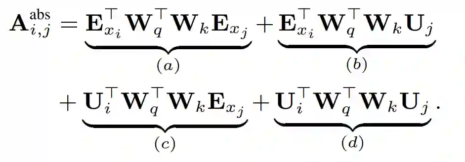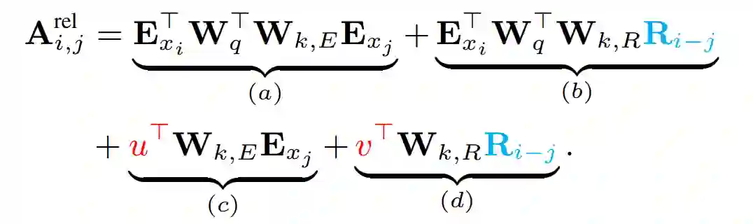 矩阵。这些向量可以被理解为两个偏置,它们并不依赖于查询的特征。c 促使模型对某些项的注意力程度比对其它项更高,而 d 促使模型对某些相对位置的注意力程度比对其它位置更高。这种替代的方式受到了下面这一事实的启发:查询相对于自己的相对位置始终保持不变。