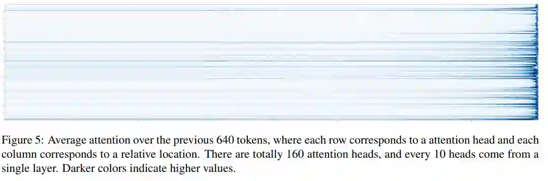 图 8:在前面 640 个词例上的平均注意力,其中每行对应于一个注意力头,每列对应于一个相对位置。图中共有 160 个注意力头,每十个注意力头同属于同一层。颜色越深代表注意力值越大。