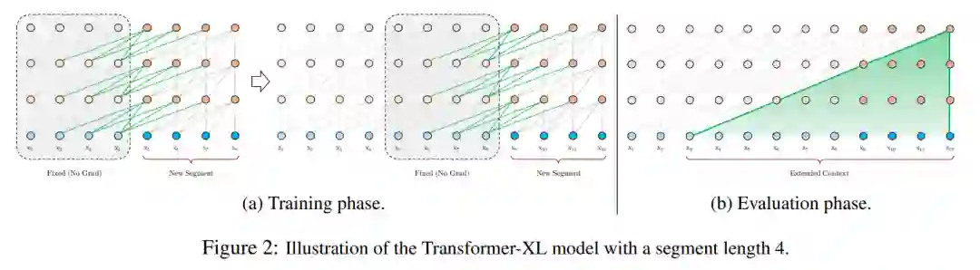 相比于降低密集型注意力操作复杂度的方式,Zihang Dai 等人受 RNN 的启发,在 transformer 的自注意机制之外引入了一种循环机制。他们的论文 "Transformer-XL: Attentive Language Models Beyond a Fixed-Length Context" (论文地址:https://arxiv.org/abs/1901.02860)介绍了两个新概念:(1)一种新的组件,它将先前「段落」的隐藏状态作为循环段落层的输入;(2)使这种策略容易实现的相对位置编码方案。