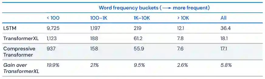 由于通过利用更长的序列所获得的收益往往是符合长尾分布的,他们专门关注了由词频刻画的离散特征的困惑度,并指出最稀有的词例带来的收益是最显著的: