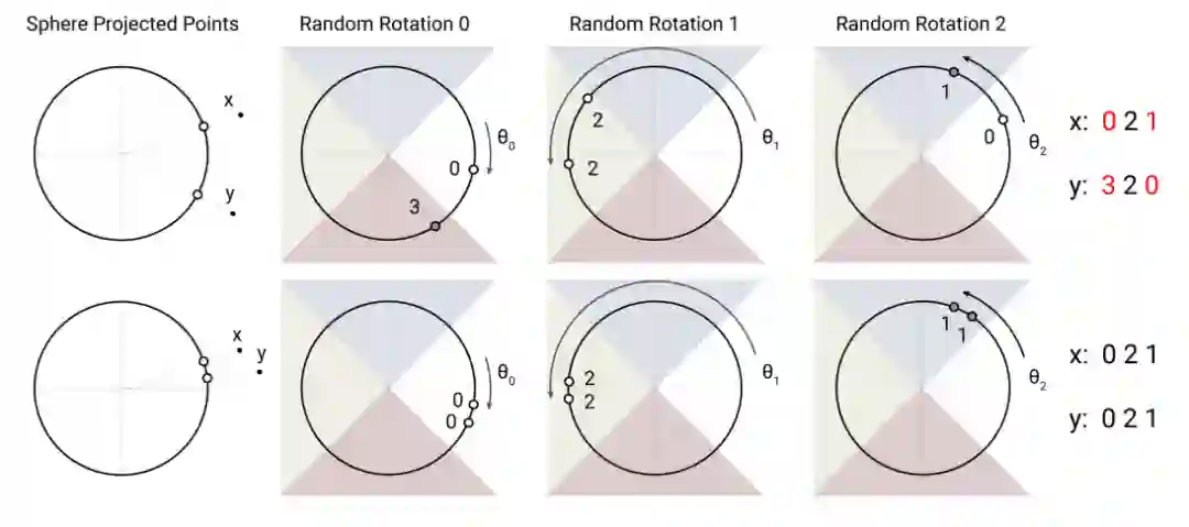 图12:角度局部敏感哈希算法示意图。图中显示了三轮哈希,每轮哈希中将空间分成了 4 个桶。在下面一排示意图的三轮哈希中中,向量都被映射到了同一个桶中,因为它们在输入中也相近;而在上面一排的第一次哈希和第三次哈希中,向量映射到了不同的桶中。