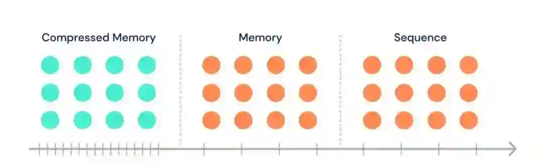 在每一个时间步上,最早的一个压缩内存会被丢弃,压缩内存的索引会回退一位。接着,常规的内存段中最早的 n 个状态会被压缩,并且被转移到压缩内存中新开的槽中。