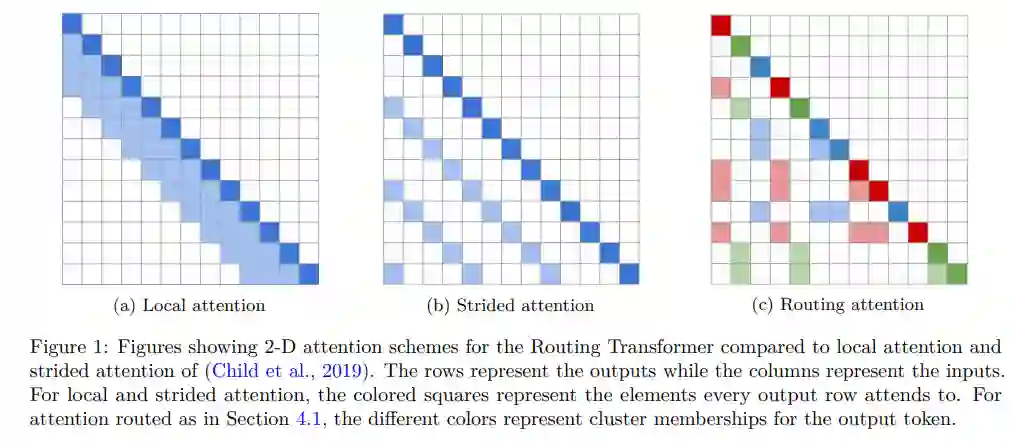 Aurko Roy 等人于 ICLR 2020 上发表的工作 "Efficient Content-Based Sparse Attention with 路由Transformers"()与前文提到的 Reformer 有一些异曲同工之妙。它们将该问题建模为了一个路由问题,目的是让模型学会选择词例的稀疏聚类