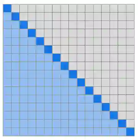 图 1:以一种自回归的形式组织的传统自注意力机制的连接模式。深蓝色方块代表「查询」向量,而浅蓝色方块代表「键」向量。