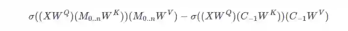 Adaptive Span Transformer 通过实现这一点的方式是:通过对序列进行掩模运算,使得学习到的每个注意力头的上下文之外的词例的贡献迅速降为零。mask(M)与 softmax 操作的分对数相乘,从而将某些词例对当前隐藏状态 x 的贡献归零,超参数 R 控制最小跨度的大小。