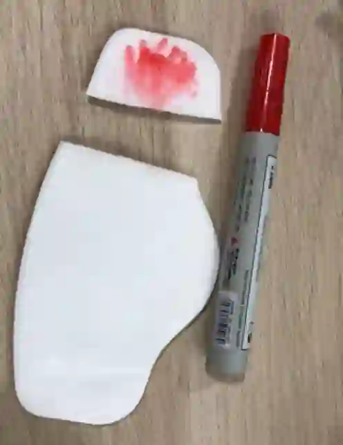 手头上可用的只有一个口罩的加厚无纺布过滤棉,用红色白板笔,画了浓墨重彩的一坨……