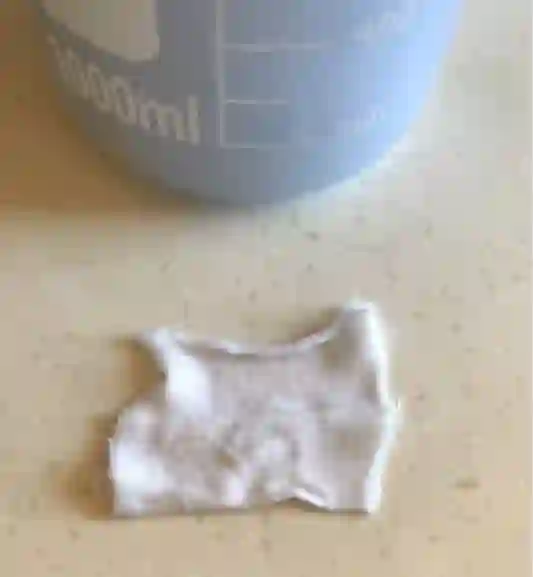 取一颗1号,放1000ml的冷水,浸泡两分钟,用力搅拌三分钟,无果,于是用手搓了一分钟,结果是这样的: