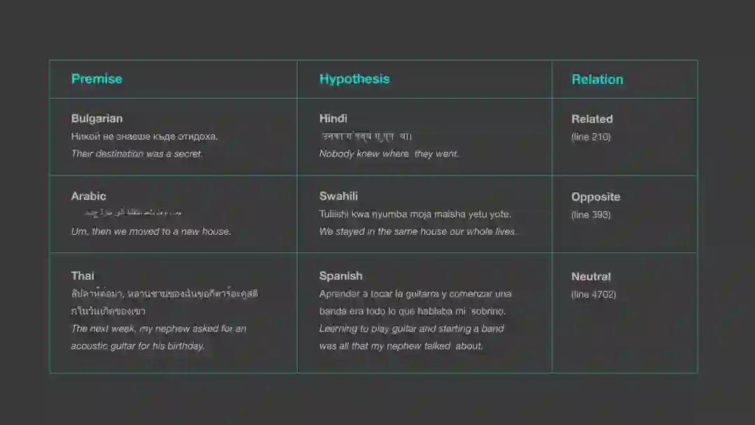 与之前需要句子为英语的方法相比,该系统是完全可以多语言的,并且支持不同语言的前提和假设的组合。下表显示了 LASER 如何能够确定不同语言的 XNLI 语料库中句子之间的关系,而以前的方法只考虑了同一语言的前提和假设。