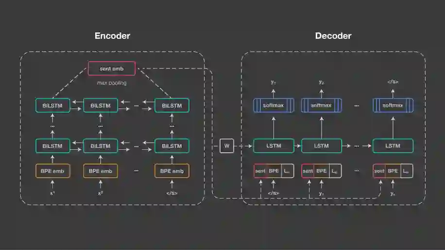 LASER 的方法建立在与神经机器翻译相同的基础技术之上:编码器/解码器方法,也称为序列到序列处理。Facebook 为所有输入语言使用一个共享编码器,并使用共享解码器生成输出语言。编码器是五层双向 LSTM(长短期记忆)网络。与神经机器翻译相比,Facebook 不使用注意机制,而是使用1024维固定大小的向量来表示输入句子。它是通过对 BiLSTM 的最后状态进行最大池化来获得的。这使得句子表示能够被比较并直接输入到分类器。下图说明的是 LASER 的结构。