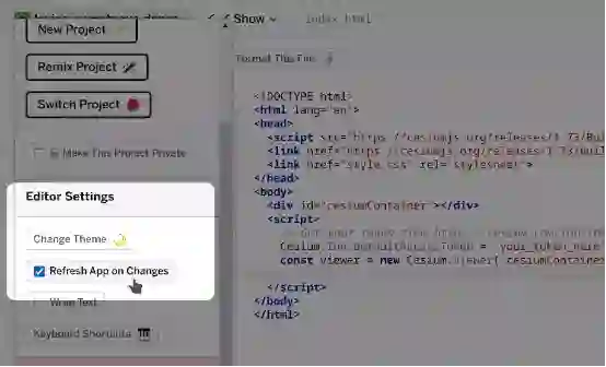 使用基础模板创建一个新的 Glitch 项目(https://glitch.com/edit/#!/remix/cesium-template)。