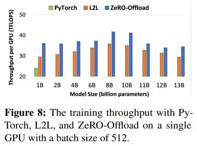 下图 8 展示了使用 PyTorch、L2L 和 ZeRO-Offload 实现的每个 GPU 吞吐量差异。从中可以看出,利用 ZeRO-Offload 实现的每个 GPU 吞吐量比 L2L 平均高出 14%(最多高出 22%)。