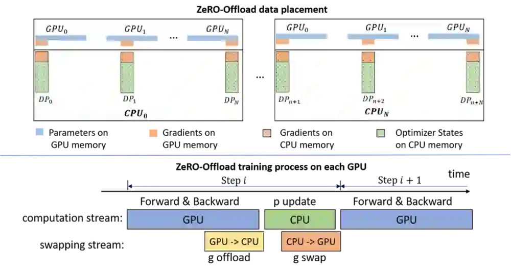 ZeRO-Offload 是一种通过将数据和计算从 GPU 卸载到 CPU,以此减少神经网络训练期间 GPU 内存占用的方法,该方法提供了更高的训练吞吐量,并避免了移动数据和在 CPU 上执行计算导致的减速问题。