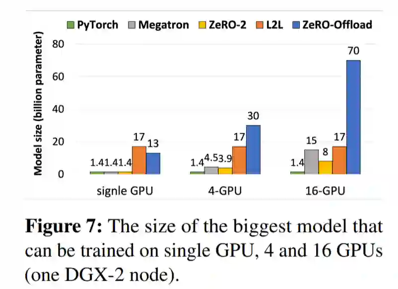 下图 7 展示了利用 ZeRO-Offload 技术在 1 个、4 个或 16 个 GPU(一个 DGX-2)上可以训练的最大模型情况。
