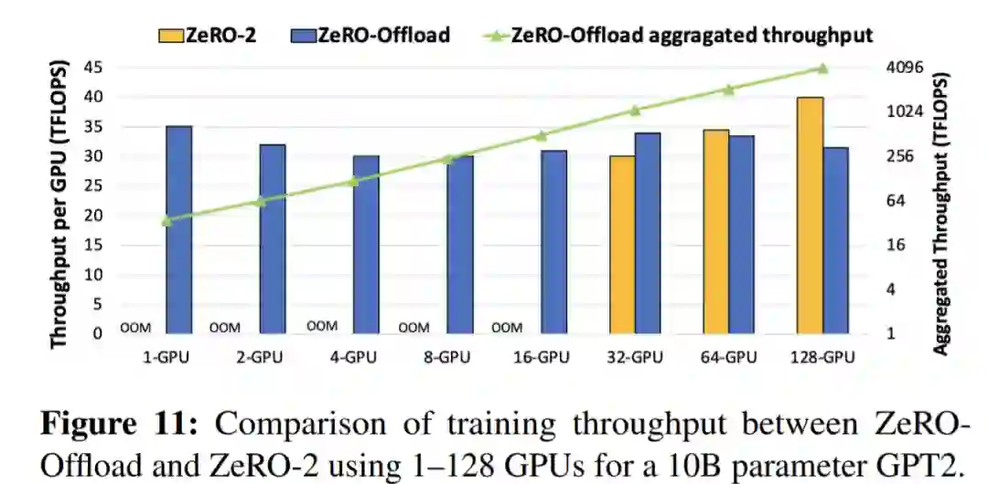 下图 11 展示了每个 GPU 的吞吐量随 GPU 数量增加而呈现的变化情况。可以看出,在 GPU 数量逐渐增加至 128 个的过程中,ZeRO-Offload 几乎可以实现吞吐量的线性加速。